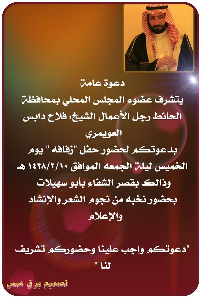 | دعوه لحضور حفل زواج موسى عواض العويمري | بدر العويمري | منتدى اخبار القبيلة | 0 | 03-25-2017 01:11 PM |