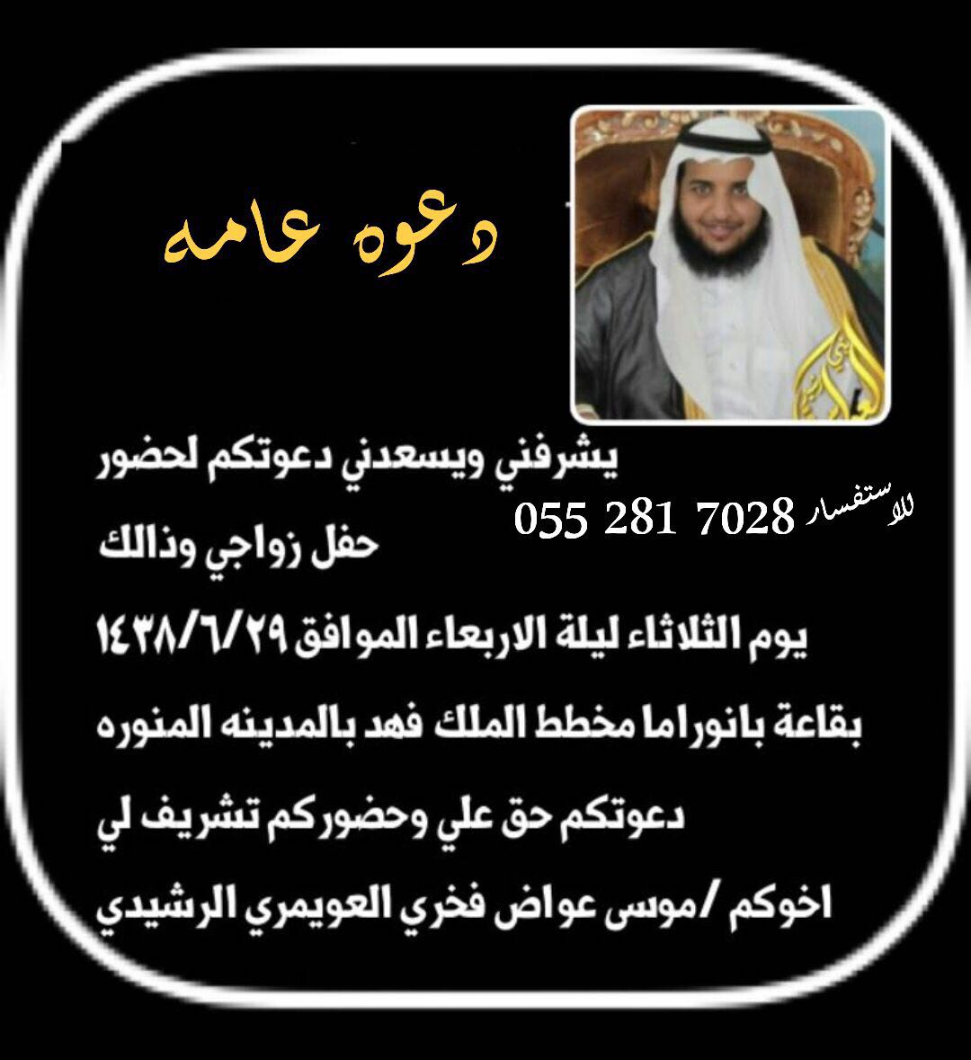 | دعوه لحضور حفل زواج موسى عواض العويمري | بدر العويمري | منتدى اخبار القبيلة | 0 | 03-25-2017 01:11 PM |