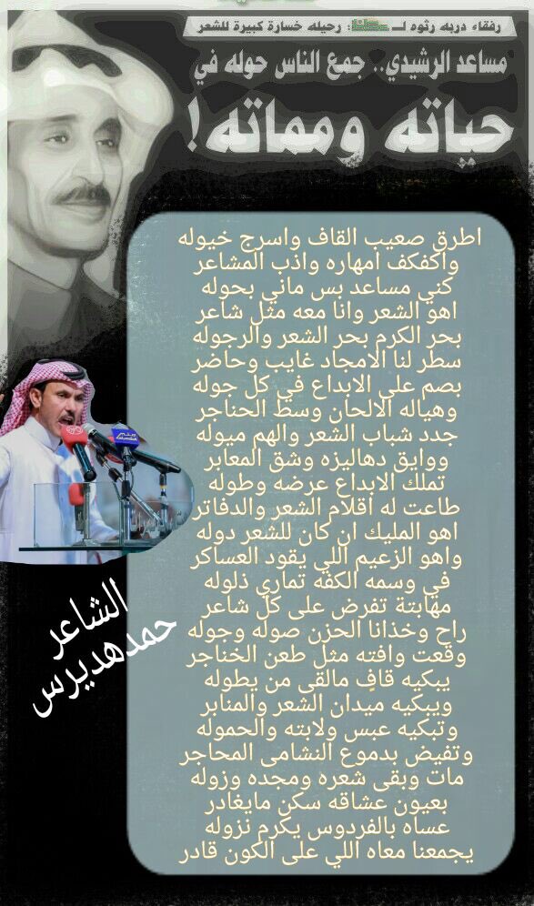 | الشاعر مساعد الرشيدي في ذمة الله | بدر العويمري | منتدى شعراء قبيلة بني رشيد عامة | 0 | 01-12-2017 08:03 PM |